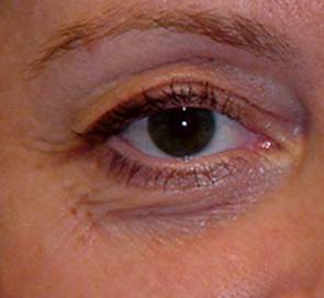 Fig.7: El surco orbitomalar ha desaparecido por haber aumentado el volumen en la zona del margen orbitario. Para aumentar el volumen se puede transponer la grasa. En el imagen pequeña a la izquierda se ve la diferencia de volumen. |