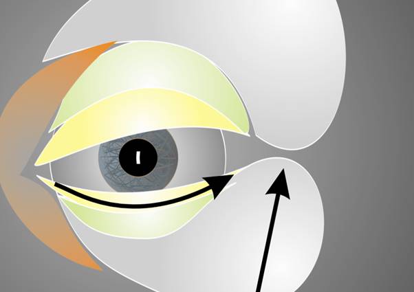 Fig.9: Vector horizontal de transposición: fijación del párpado por medio de una cantoplastia en el ángulo lateral. Vector vertical de transposición: lifting malar |
