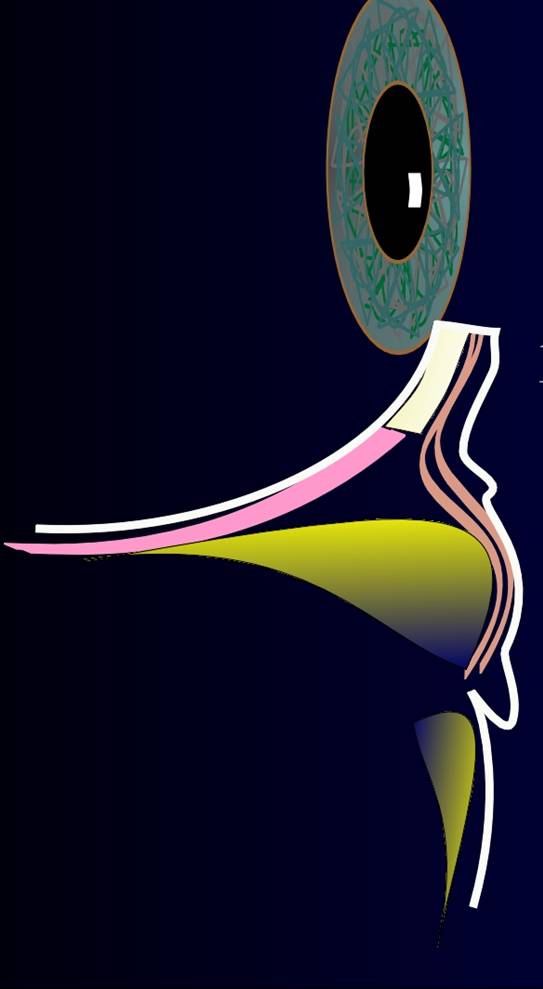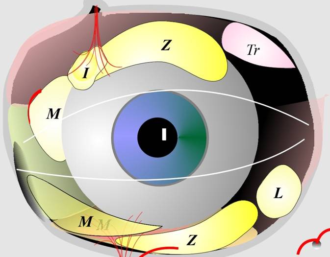 Fig.5: Compartimentos de grasa orbitaria: M=grasa medial, Z=grasa central, L=grasa lateral. El volumen de la grasa orbitaria puede aumentar durante la vida y producir bolsas de grasa. |