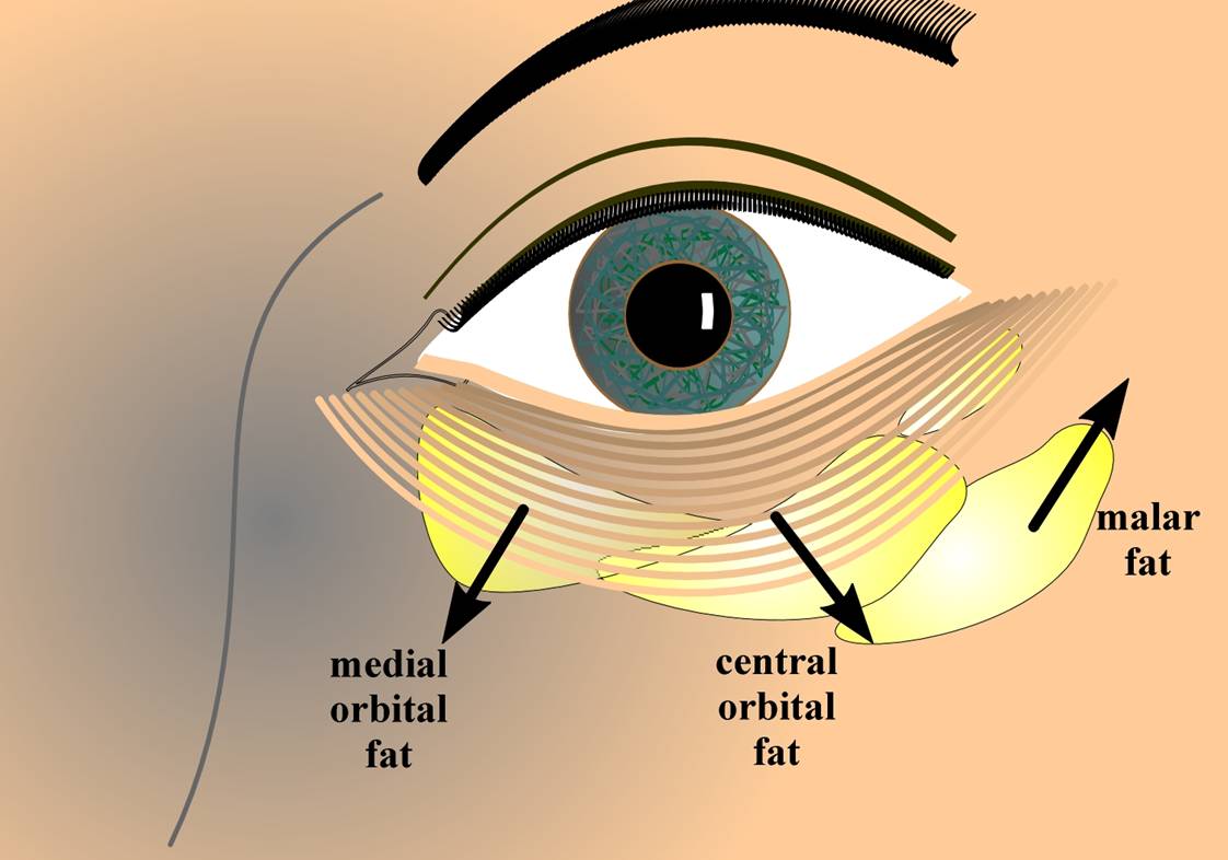 La grasa orbitaria sirve como un rodamiento para el globo ocular permitiento su movimiento y el movimiento de los músculos extraoculares. La grasa orbitaria sufre dos cambios durante la vida: primero por la dilatación de las membranas (el septo orbitario) que retienen la grasa, se produce una caída (hernia) de la grasa, secundariamente hay una tendencia al aumento de volumen de grasa con la edad. El volumen y la herniación de la grasa se demuestra entre los surcos. Previamente a la cirugía hay que decidir si tenemos que eliminar la grasa excesiva o aprovechar del volumen de la grasa para rellenar el surco. (Fig. 6-9)