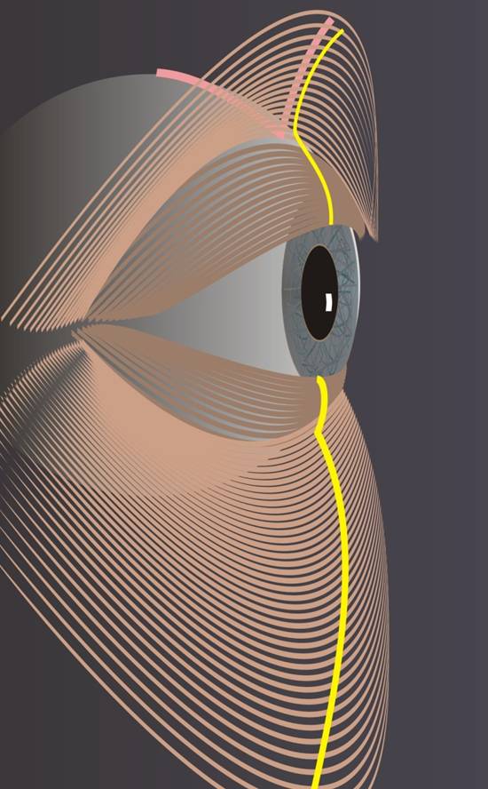 Fig. 2: La línea ideal del contorno del párpado inferior es una curva contínua. Los cambios en la edad pueden producir varios bultos (convexidades) y surcos (concavidades). |