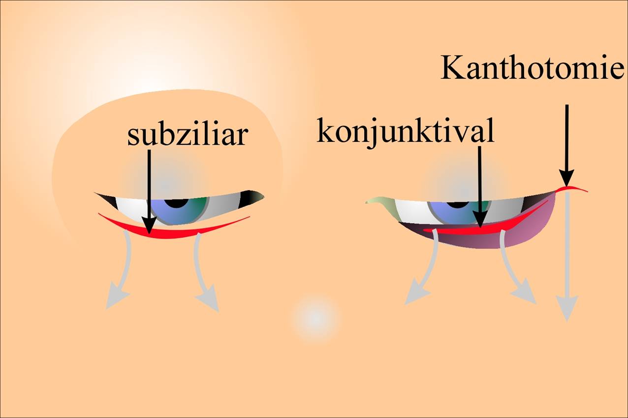 Fig.4.: Accesos: Ojo izquierdo: combinación entre el acceso posterior (conjuntival) y el acceso por el ángulo lateral (cantoplastia), Ojo derecho: acceso anterior (transcutáneo, subciliar) |