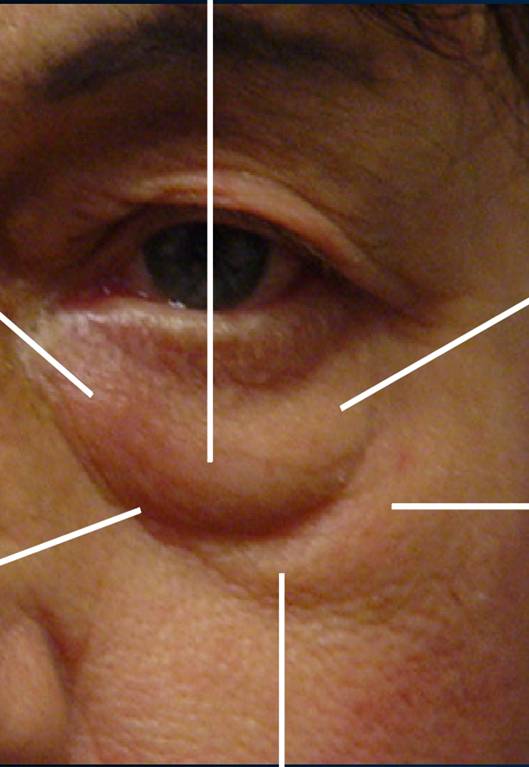 Fig.6: Flechas superiores: los surcos palpebrales normales del párpado superior e inferior. La grasa orbitaria forma un bulto entre los surcos. Flecha inferior: el surco orbitomalar |