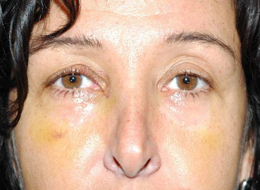 Fig.17: Una semana después de la operación con transposición de grasa. Se nota un resto de hematoma que marca la zona malar donde se ha realizado la transposición de grasa |