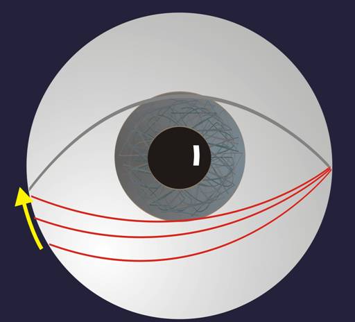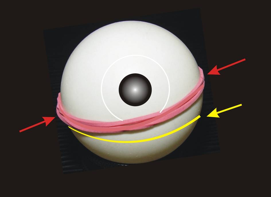 Fig.3.: La goma roja representa la elasticidad del margen palpebral y está colocada en el ecuador del globo entre los ángulos (flechas rojas). Si el ángulo lateral desciende (flecha amarilla), el párpado tiende a descender incluso más (linea amarilla). |