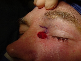 Fig. 2: Defecto de la zona 0 ( fuera del margen orbitario). Es un defecto en la concavidad entre la nariz y el canto interno del párpado que solo incorpora una lamela. Solo hay que reconstruir la lamela de la piel. |