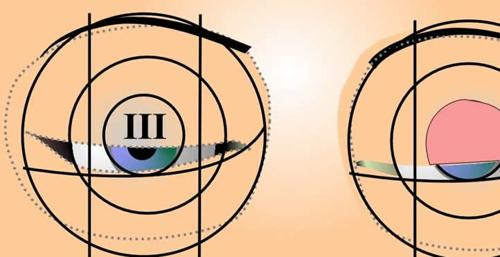 Fig.3.: Defecto de la zona I (entre el margen orbitario y el ecuador del globo) y la zona II (entre el ecuador del globo y la córnea) |