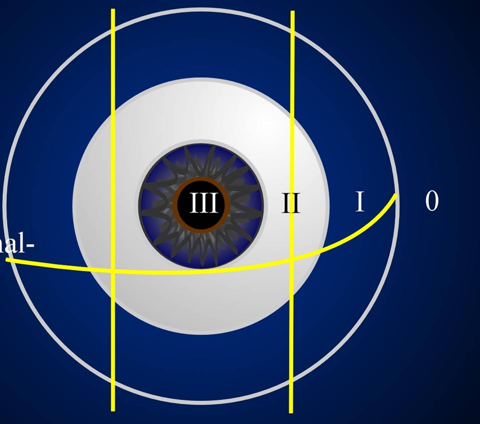 Zonas de defectos tumorales: Zona 0 = fuera del margen orbitario Zona I= entre el margen orbitario y el ecuador del globo ocular |