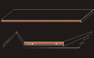 Fig. 6: Arriba: Anchura de incisión de 50 mm .Abajo: Por el efecto de la elasticidad de la piel en pacientes jóvenes el injerto se puede retraer hasta en un 50 % mientras se aumenta el espesor al doble. |