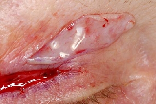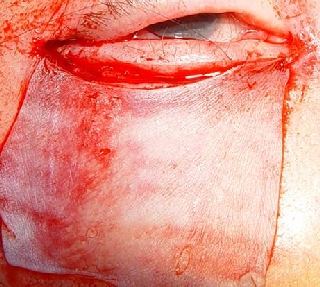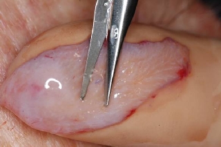 Fig. 1: Se ha recortado piel excesiva del párpado superior para transplantarla. En su lado posterior se nota una capa con aspecto "gelatinoso" que hay que eliminar. |