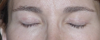 Fig. 10: 2 semanas después de implantar injertos de piel (20 x 8 mm) obtenidos con un dermatomo del brazo para corrigir la falta de piel de los párpados inferiores. El espesor y la transparencia de la piel es compatible con la piel palpebral natural. |