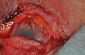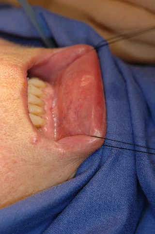 Fig. 5: área expuesta en el labio inferior mediante hilos de fijación. Con el dermatomo / mucotomo motorizado con un espesor de corte ajustable de 0,1 a 0,5mm y cuchilla de 50 mm de anchura podemos obtener injertos de mucosa de una superficie amplia. La herida creada por el dermatomo se cicatriza en pocos dias. |