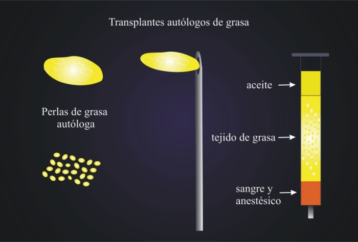 La grasa autóloga se obtiene del propio paciente, se puede inyectar sin incisiones en la zona periorbitaria o introducir por las incisiones de la cirugía palpebral. Para aumentar el volumen permanentemente, las células de grasa (adipocitos) deben sobrevivir en su nuevo entorno, exclusivamente aquellos adipocitos intactos con suficiente nutrición vascular pueden sobrevivir. La técnica de obtención de tejido graso tiene la misma importancia que la técnica de implantación de la misma. Se deben separar las células intactas de la grasa libre ya que se transplantarán exclusivamente las células intactas y los preadipocitos (células multipotentes mesenquimales que se transformarán en adipocitos adultos). La implantación ha de localizarse en contacto con las capas que posean suficiente nutrición vascular como el músculo orbicular y los músculos perioculares.