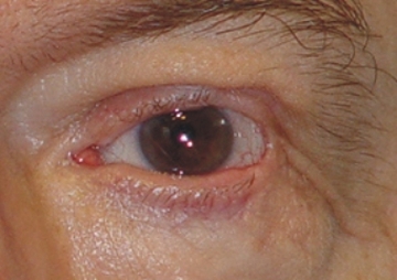 Fig. 5: Preoperatorio: Trauma del canto lateral por mordedura de perro. Canto redondo sin ángulos, posición de telecanto (se ha alejado del polo lateral y acercado al eje optico). |