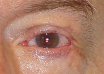 Fig. 4: Postoperatorio: Mediante la reconstrucción de los los ligamentos del canto se ha obtenido un ángulo de 30° y se ha acercado el canto al polo lateral. |