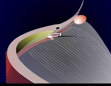 Fig. 5: La sutura (blanca) conecta el tarso (amarillo) con los retractores debajo de la carúncula (rosa). |