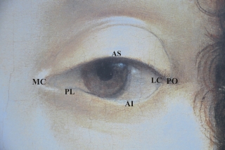 Fig. 2: MC (canto medial, sin contacto con la superficie ocular); PL (el punto lagrimal inferior forma un ángulo); el AI (ápice inferior) está situado lateralmente del AS (ápice superior); LC (punto de fusión de los párpados en el canto lateral); PO (punto de fijación de los tendones cantales laterales al periósteo). |
