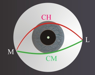 Fig. 1: Hendidura palpebral normal asimétrica. El canto lateral (L) es situado más alto que el canto medial. Por ser más larga la curva del párpado superior abierto (CH) que la curva del párpado superior cerrado (CM) el músculo orbicular facilita el cierre palpebral y el parpadeo. |