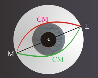 Fig. 2: La hendidura palpebral con el canto lateral alto es simétrica. La recta (linea negra) entre el canto medial (M) y el canto lateral (L) cruza el eje óptico. Las curvas del párpado inferior y superior son curvas meridionales. Por ser igual de largo la curva del párpado superior abierto (CM rojo) que la curva del párpado inferior cerrado (CM verde) el cierre palpebral está inhibido y se puede observar una pseudoretracción. |