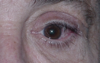 Fig. 4: Postoperatorio: mediante una cantoplástia combinada se ha bajado el canto lateral. La linea recta entre los cantos está situado debajo del eje óptico. La pseudoretracción desaparece sin haber tocado el elevador. |