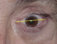 Fig. 3: Preoperatorio: Altura excesiva del canto lateral: la recta entre los cantos (linea amarilla) cruza el eje óptico. El párpado superior abierto está situado en una curva meridional, que inhibe el efecto de cierre del músculo orbicular y causa una pseudoretracción por el antagonismo del músculo elevador. |