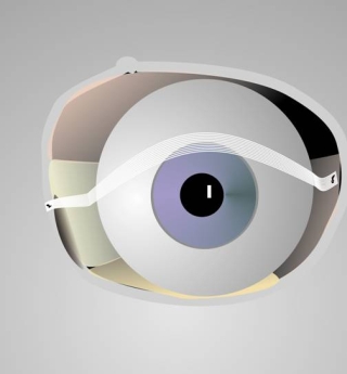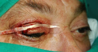 Fig. 4: Implantación de una tira de fascia lata para reforzar la fijación de los cantos en un caso de flaccidez (floppy eyelid) con pérdida de los ligamnetos cantales y canto lateral alto. |