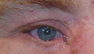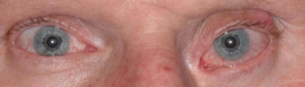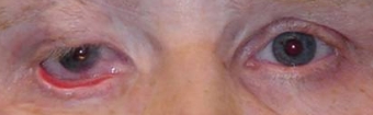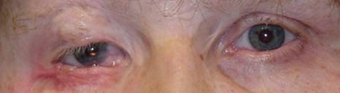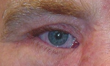 Fig. 5: Telecanto medial causado por la laxitud de los ligamentos cantales mediales y la desinserción medial del músculo orbicular. |
