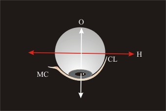 Fig. 1: El canto medial (MC) forma un ángulo en el punto lagrimal, mientras el canto lateral (CL) está situado tangencial a la superficie del globo ocular. |