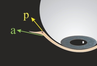 Fig. 2: El ángulo del del canto medial se forma entre el ligamento posterior (p), que sigue tangencial al la superficie del globo ocular hacía la cresta lagrimal posterior y el ligamento anterior (a), que aleja el párpado del globo ocular hacía la su inserción en la cresta lagrimal anterior. Los canalículos lagrimales se encuentran entre los dos vectores (a,p). |