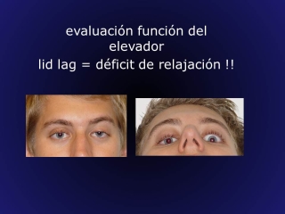 El signo más típico para detectar una ptosis adquirida complicada es el lid lag. Si hay defectos en el tejido fibroelástico y una degeneración de grasa, el párpado baja menos que el globo ocular en la mirada hacía abajo, que se interpreta como deéficit de relajación. (Fig. 3)