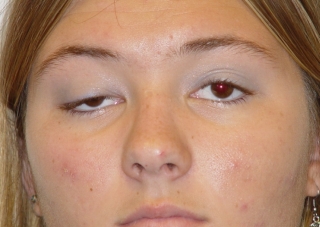 Fig. 17. Postoperatorio: Recesión del músculo elevador excesiva. Esta complicación se puede corregir mediante una segunda intervención del músculo elevador derecho. |