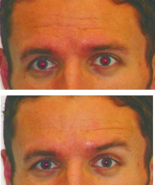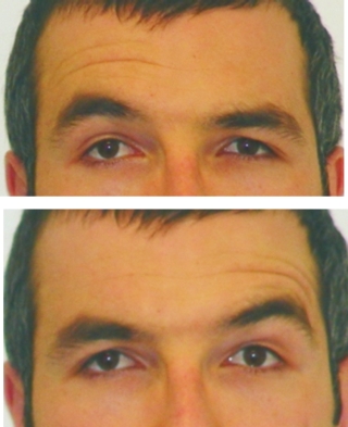 Fig.6. Inervación individual bilateral: con el intento de elevar la ceja derecha solo se estimula el lado derecho del músculo frontal (arriba). Con el intento de elevar la ceja izquierda solo se estimula el lado izquierdo del músculo frontal (abajo). |