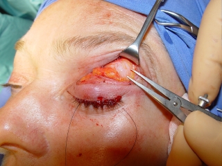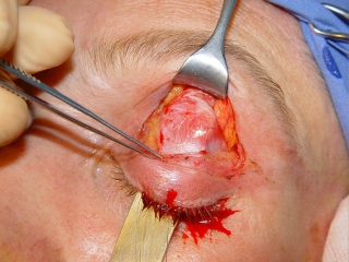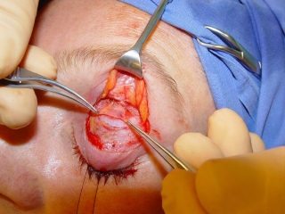 La incisión de la piel y la separación del músculo orbicular es idéntica como en la blefaroplastia superior. El septo se abre para exponer la aponeurosis y el músculo elevador. La altura ideal para separar el músculo elevador de la aponeurosis y del músculo de Müller se encuentra en el nivel del fornix superior. Para localizar este nivel, se introduce una espatula en el fornix superior, cuyo extremo puede llegar casi hasta el ligamento de Whitnall (Fig. 7). Encima del extremo de la espátula se secciona todo el tejido del elevador sin perforar la conjuntiva. Esta sección alta sólo necesita una anchura de un tercio del párpado para conseguir una recesión completa del elevador (Fig. 8). Si se secciona la aponeurosis en un nivel más bajo, la incisión tendría que ser ampliada por todo el ancho del párpado para incluir todas las extensiones de la aponeurosis hasta los cantos. Otra desventaja de la sección más baja sería la formación del surco palpebral en un nivel demasiado alto. Después de haber creado la sección completa del elevador, se observa la separación del tejido del elevador. Para mantener la distancia de prolongación del elevador injertamos un transplante de la fascia que cubre el cojín de grasa dabajo de la ceja (ROOF) (Fig. 9,10)