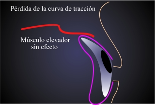 Fig.7: La falta del globo ocular y la reducción del volumen orbitario permite un descenso del músculo elevador, que pierde su curva de tracción y su efecto de elevación. |