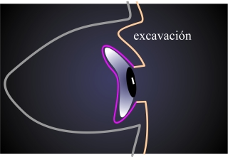 Fig.1: Anoftalmo con solución protésica: Para recuperar el volumen del contenido orbitario se ha introducido un implante esférico en la órbita. Para restaurar el aspecto de la superficie ocular, el paciente introduce una prótesis hemiesférica en el saco conjuntival. Para mantener la movilidad, la prótesis no debe rellenar el saco conjuntival por completo. |