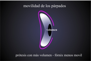 Para evitar que la prótesis se quede hundido, hay dos formas de aumentar el volumen de contenido orbitario. Facilmente y sin cirugía se puede aumentar el volumen de la prótesis, pero hay que contar con una limitación de la movilidad y un aspecto menos natural y más rígido. La prótesis con más volumen llena los fornices y los quita la movilidad de plegar y desplegar. Para elevar el párpado superior (corregir una ptosis del párpado superior) frecuentemente se intenta engrosar el margen superior de protesis. Hay que contar con la desventaja de bloquear el parpadeo e inhibir el cierre.