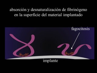 Fig.10.: La absorción y denaturalización del fibrinógeno en la superficie del material implantado provoca la apertura de los lazos del fibrógeno para iniciar el efecto llamada al proceso de fagocitosis. |