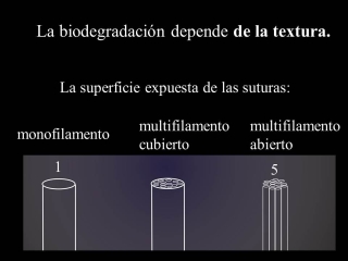 Fig.11.: Hay que considerar las suturas como implantes heterógenos. Pueden ser monofilamentos, multifilamentos con funda o múltifilamentos abiertas. Los monofilamentos y los múltifilamentos cubiertos se exponen con menos superficie a una reacción inflamatoria que los multifilatmentos abierteas, que tiene que cinco veces más superficie (5). |