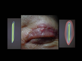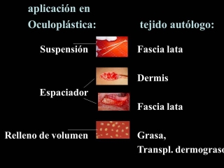 Fig.5.: La implantación autóloga de fascia lata (suspensión o espaciador) autóloga o de dermis autóloga (relleno o espaciador) no suele causar granulomas. La grasa (dermograsa, lipofilling injectable o el transplante de perlas de grasa) tiene más tendencia de formar granulomas cuando los lipocitos estan dañados y pierden su contentido. |