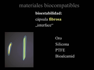 Fig.6.: Materiales no autólogos como los anorgánicos (oro), ó materiales orgánicos sintéticos (polímeros), se tienden a encapsular en una capsula fibrosa. La cápsula (interface) les protege temporalmente o a largo plazo de una reacción de rechazo. El rechazo se produce por la erosión, la ruptura de la cápsula o una infección dentro de la capsula. Si esto ocurre, hay que retirar el implante. |