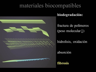 Fig.7.: Los polímeros implantados pueden ser tolerados durante muchos años. La biodegradación es un proceso de fractura continua de los polímeros, que termina en la monomerización. La monomerización causa hidrólisis y absorpción o fibrósis y granuloma. |
