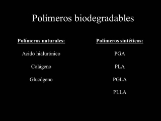 Fig.8.: Diferenciamos polímeros naturales, parecidos a substancias naturales (acido hialurónico, colágeno, glucógeno) y polímeros artificiales sintéticos, que no parecen a substancias naturales (ácido poliglicólico etc.) |