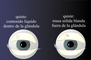 El material que provoca un granuloma es el contenido graso de las glandulas de Meibom. Se trata normalmente de una aceite de lipidos muy finos con poca viscosidad. Procesos químicos pueden alterar la viscosidad y transformar el liquido en una masa de alta viscosidad o incluso sólida. La consequencia es la obturación de la salida y el aumento de la presión en la glandula, que primero se dilata y luego se puede romper. La rotura de la glandula permite la salida del contenido que luege provoca la formación de un granuloma.
