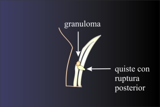 Fig.3: La ruptura de quiste hacía atras forma un granuloma en la superficie posterior del tarso. Si tambien hay una ruptura hacía delante se puede formar un segundo granuloma delante del tarso. |