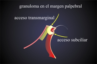 Hay que tener en cuenta, que puede haber varios quistes y granulomas en una zona hinchada. Siempre hay que evertir el párpado para ver si hay una perforación posterior (Fig.3). Sólo elegios el acceso posterior por la tarsoconjuntiva, si ya hay una lesión y una protrusión del granuloma en este lado. Si el tarso está intacto, siempre elegimos el acceso anterior, para evitar la formación de cicatrizes en el tarso. Un granuloma en el margen palpebral se opera por un acceso en la línea gris del margen palpebral o/y una segunda incisión por la piel subciliar (Fig.4).