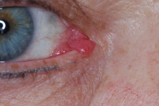 Fig. 4.: Papiloma conjuntival lobular. Su color rosa pálida se debe a su moderada queratinización secundaria por su exposición al exterior. |