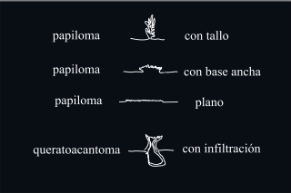 Fig.1.: Tres diferentes formas de papilomas: con tallo, con base ancha, plano. El queratoacantoma es premaligno y puede parecer a una veruga seboréica. |