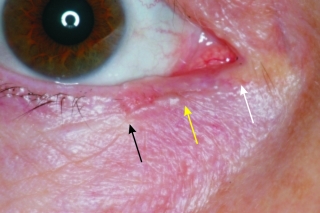 Fig.2.: Crecimiento subcutáneo de una recidiva en la zona medial hacía la flecha blanca. En la flecha blanca no se observaba una recidiva hasta el canto medial, pero la análisis histopatológica lo mostraba.