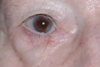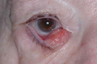 Fig. 2: Después de la excisión con un margen de seguridad de 6mm. El defecto medial se ha reconstruido con un colgajo conjuntival del párpado superior. |