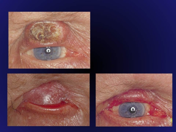 Fig.4: Queratocantoma inicial con evolución de malignización a formar un carinoma espinocelular. Resección y reconstrucción del párpado superior por un colgajo de lamela posterior inferior (abajo izquierda). Resultado después de abrir el colgajo (derecha). |
